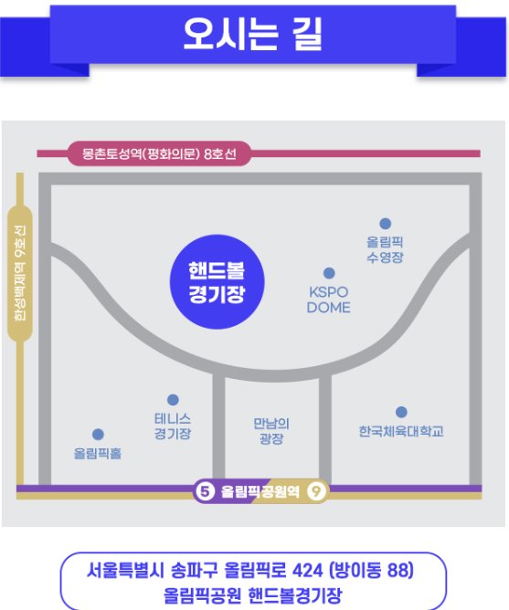- 주소: 서울 송파구 올림픽로 424, 올림픽공원 핸드볼 경기장