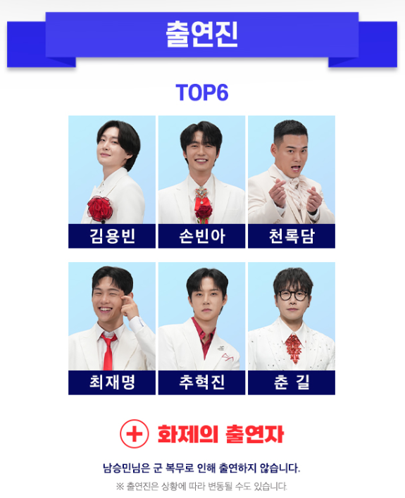 안타깝게도 TOP7에 진입한 남승민은 군복무로 인해 출연하지 않습니다.