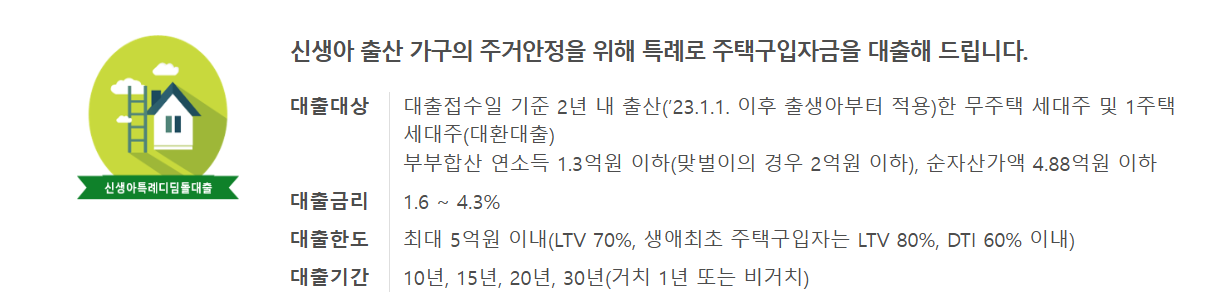 자격 요건: 대출 신청일 기준 2년 이내에 출산한 무주택 세대주